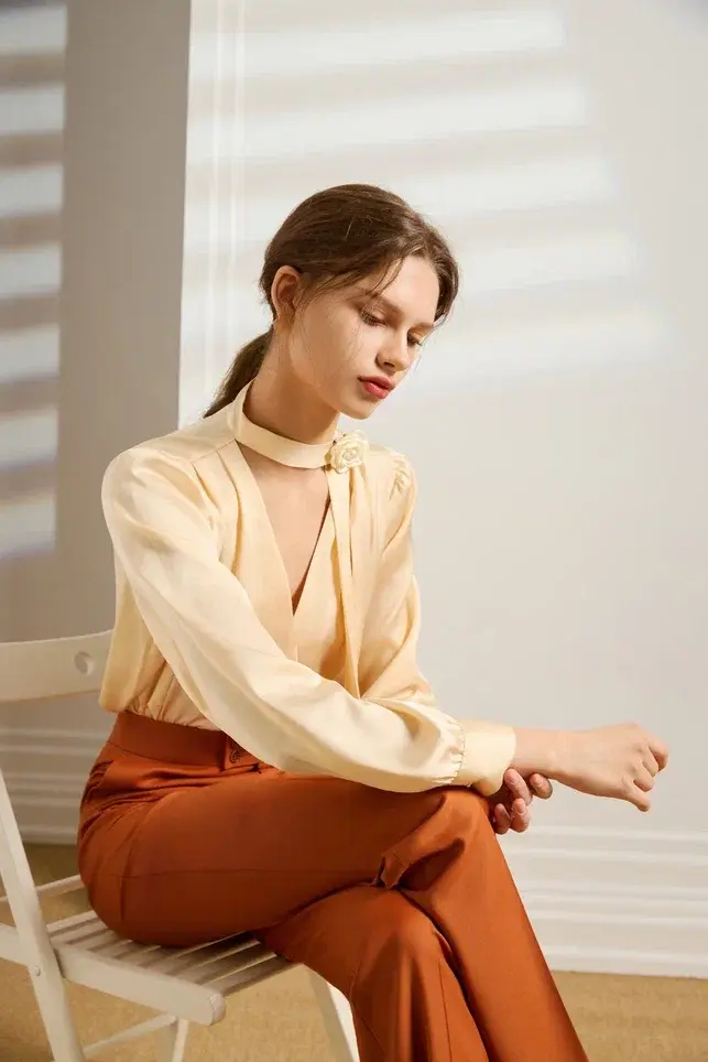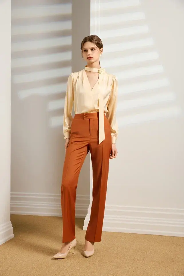 Комплект: блузка цвета шампань и брюки терракотового цвета